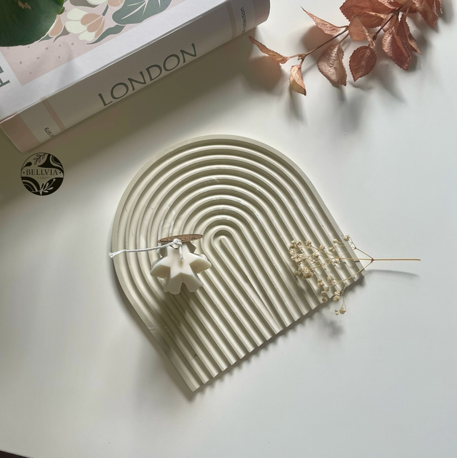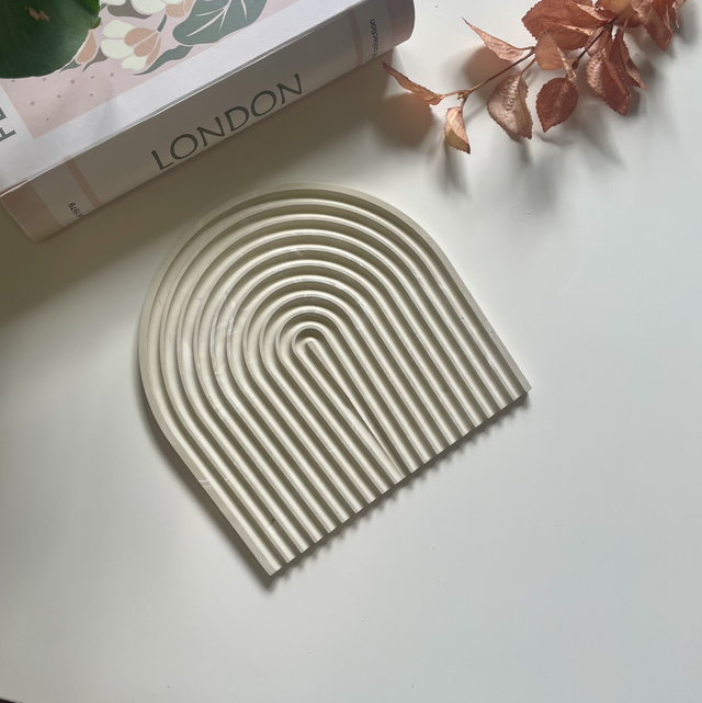 Diese dekorative Ablage in moderner Bogenform ist ein stilvoller Allrounder für dein Zuhause. Ob als Schmuckablage auf dem Nachttisch oder als hitzebeständiger Untersetzer für Kerzen – das durchdachte Rillendesign schützt empfindliche Oberflächen und sorgt zugleich für einen ästhetischen Akzent.