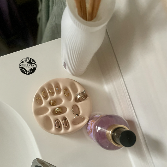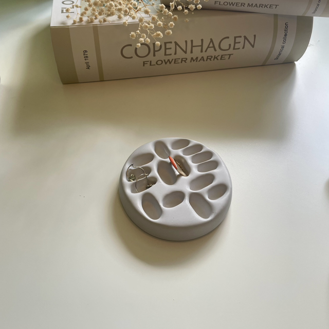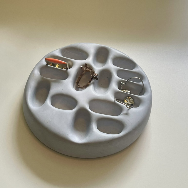 Dieser handgefertigte Schmuckhalter überzeugt durch seine einzigartige, organisch geformte Oberfläche mit mehreren Vertiefungen – ideal zur stilvollen Aufbewahrung von Ringen, Ohrsteckern oder kleinen Ketten. Funktion trifft Design – perfekt für Bad, Schlafzimmer oder Schminktisch.
